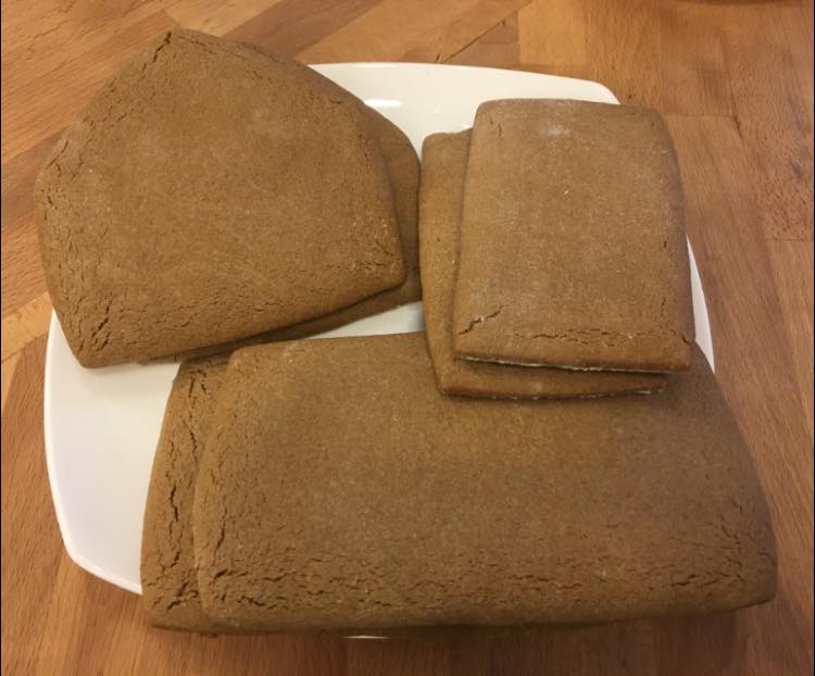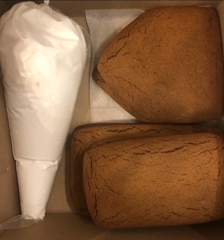 All the pieces you need to build your own gingerbread house, plus the icing to construct it!